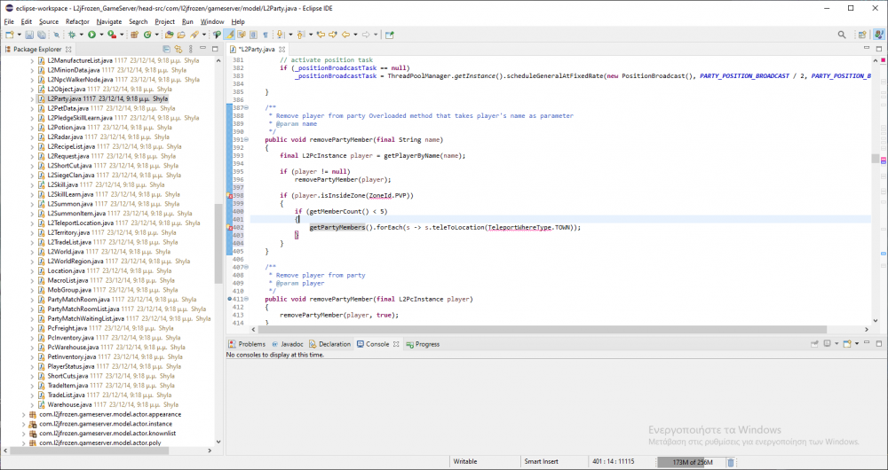 { } if (player.isInsideZone(ZoneId.PVP)) { if (getMemberCount() < 5) { getPartyMembers().forEach(s -> s.teleToLocation(MapRegionTable.TeleportWhereType.Town)); } } } i added this one under this part of code on L2Party.java /** * Remove player from party Overloaded method that takes player's name as parameter * @param name */ public void removePartyMember(final String name) { final L2PcInstance player = getPlayerByName(name); if (player != null) removePartyMember(player); but i am getting an error on (ZoneId.PVP) -