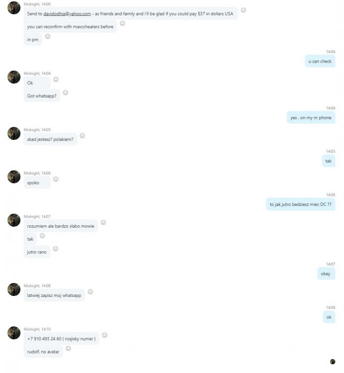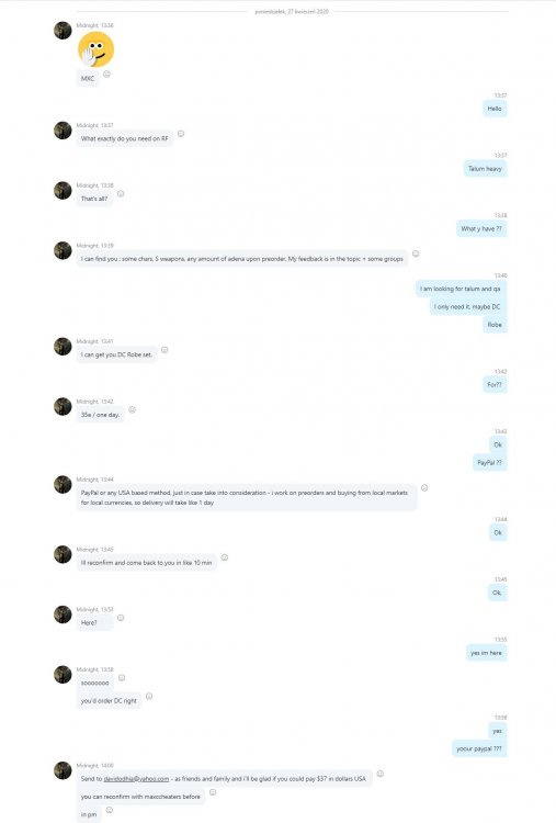 5. 2 members active in this conversation (including you) ThyLyghT Read: Yesterday at 04:59 PM Michał Read: Just now PREV 1 2 Page 2 of 2 Report reply ThyLyghT 0 Replied: yesterday at 10:48 AM screenshot please Quote Report reply ThyLyghT 0 Replied: yesterday at 11:02 AM from the transaction details...so i can see how it is taxed and see if it's friends and family Quote Report reply Michał 0 Replied: yesterday at 11:03 AM i send for your email Quote Edit Report reply Michał 0 Replied: yesterday at 11:04 AM yes i make like friends and family Quote Edit Report reply ThyLyghT 0 Replied: yesterday at 11:05 AM k sec Quote Report reply Michał 0 Replied: yesterday at 11:15 AM And ?? Quote Edit Report reply ThyLyghT 0 Replied: yesterday at 11:17 AM ok, it's alright waiting you home? Quote Report reply Michał 0 Replied: yesterday at 11:20 AM good as I will be at home I will know Quote Edit Report reply ThyLyghT 0 Replied: yesterday at 11:29 AM Sure please give me skyoe or whatsapp details Btw friend says we need to sell cov and sws What is your best offer for cov now? Quote Report reply Michał 0 Replied: yesterday at 11:33 AM my friend buy ee with pow for 25 so i can pay max 30 for cov i go AFK ( skype miswiatczak@gmail.com) Quote Edit Report reply ThyLyghT 0 Replied: yesterday at 11:38 AM Ok want wc for 30? I tell friend Quote Report reply Michał 0 Replied: yesterday at 11:45 AM if u want sell wc for 30 i buy it Quote Edit Report reply ThyLyghT 0 Replied: yesterday at 11:47 AM My friend wants. He added u in skype but can talk here. Wc is ready Quote Report reply Michał 0 Replied: yesterday at 11:49 AM Okey when ill be at home i but it Quote Edit Report reply ThyLyghT 0 Replied: yesterday at 11:50 AM Ok let me know Or he can give paypal now As u wish Quote Report reply Michał 0 Replied: yesterday at 02:21 PM Ok im in home Quote Edit Report reply Michał 0 Replied: 23 hours ago I will be at home for 0,5h Quote Edit Report reply Michał 0 Replied: 23 hours ago So im home i wsit for pass Quote Edit Report reply Michał 0 Replied: 23 hours ago My nick on disco majkel#6329 Quote Edit Report reply Michał 0 Replied: 18 hours ago Hey , i still w8t for pass to bd with DC robe set