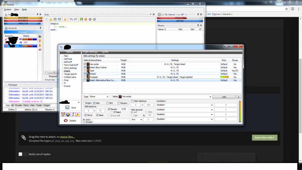 1. The char re-use the seed if not sowned but when mob is dead it don't use the harvester, why? Is this set-up correct? I'm not good in using this bot; please be as much specific as you can, thanks :)