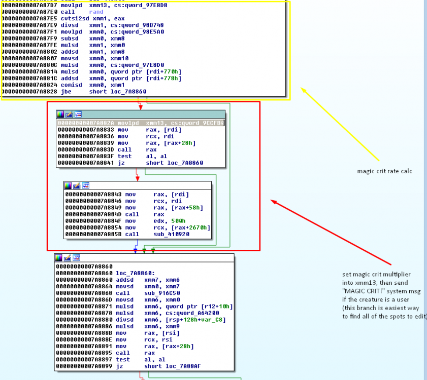 oh boy you're definitely wrong, what i posted is the exact addresses you need to edit, they are all "mov xmm*, 4.0" lemme show a specific example from one of them, 0x7A882A then way way way further down in that function xmm13 is used as the multiplier to the damage value this is why it pays to know the asm rather than just pressing F5 in ida and looking at c-like code cuz you'd be hard press to spot this in all of that crap, but if you know the asm you know exactly what to look for so what you need to do to edit the crit rate from 4.0 to some other value, is you need to change all of those addresses I put in the previous post .text:00000000007A882A movlpd xmm13, cs:qword_9CCFB0 .text:00000000007A9071 movlpd xmm10, cs:qword_9CCFB0 .text:00000000007A98DA movlpd xmm9, cs:qword_9CCFB0 .text:00000000007AA14B movlpd xmm10, cs:qword_9CCFB0 .text:00000000007AFED5 movlpd xmm12, cs:qword_9CCFB0 .text:00000000007B274E movlpd xmm9, cs:qword_9CCFB0 overwrite the address they're pulling the 4.0 modifier from with the address to your own modifier double, if you're using vanganth's you'd do it like this double dMageCritPowerModifier = 2.0; g_HookManager.WriteRelativeAddress(0x7A882A, 3, &dMageCritPowerModifier, 0); -