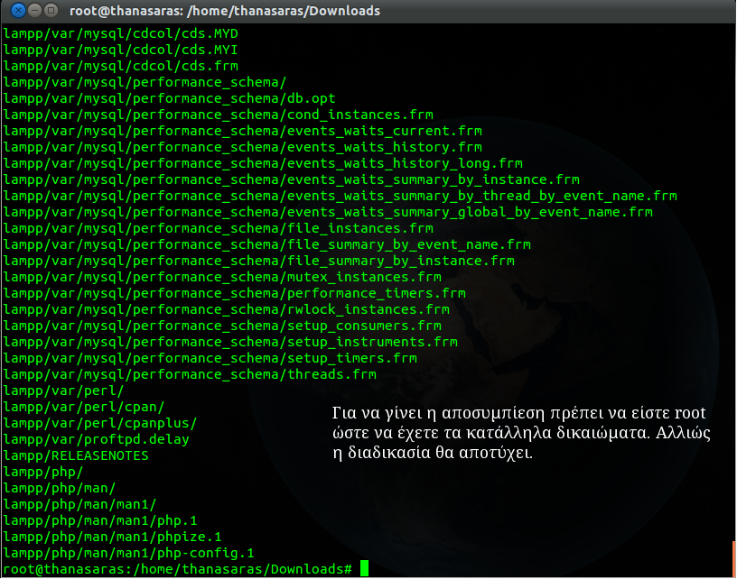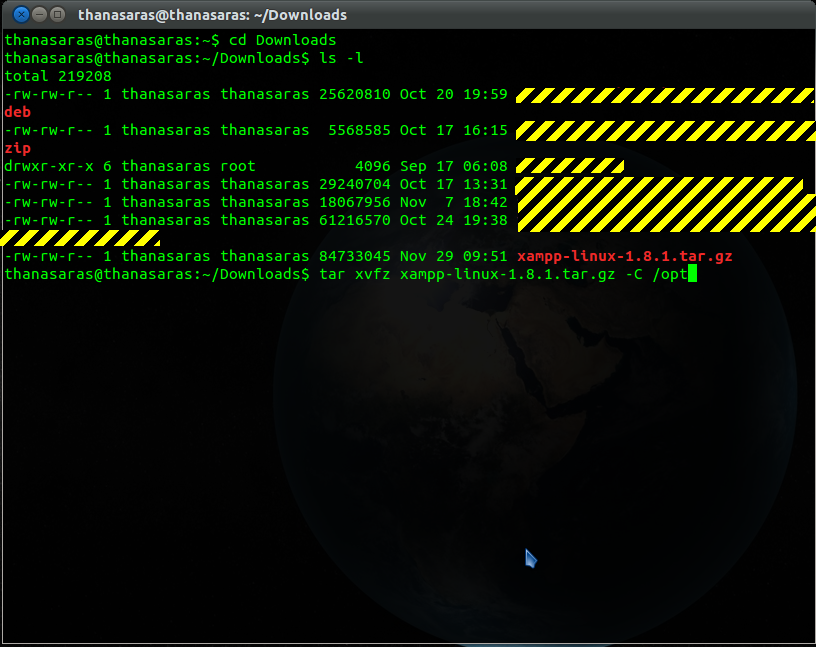 Μόλις το κάνουμε αυτό θα πάμε στη διαδρομή που κατεβάσαμε το xampp. Έστω πως είναι στο Downloads. Θα πατήσουμε από το terminal "cd Downloads" και θα πατήσουμε enter και θα μεταφερθούμε στη διαδρομή Downloads. Στη συνέχεια θα πληκτρολογήσουμε την εντολή "tar xvfz xampp-linux-1.8.1.tar.gz -C /opt". Αυτό που θα κάνει είναι να κάνει extract τα αρχεία που βρίσκονται μέσα στο συμπιεσμένο αρχείο στο φάκελο /opt.